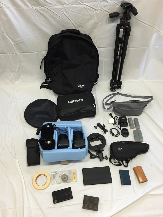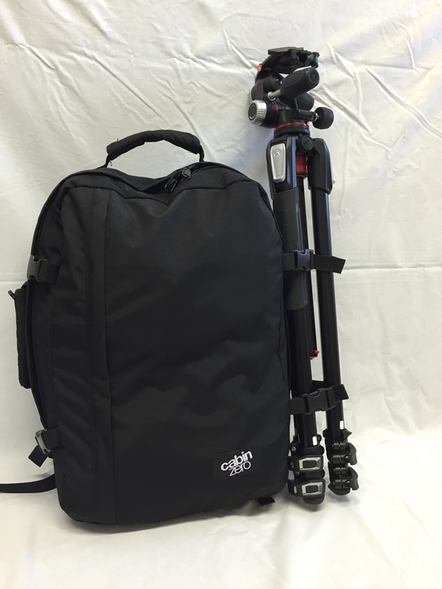 その他もろもろ入れて、再度のバックルにManfrottoの055を無理やり固定。ちょっと無理ありますね。雲台外すかカーボン+4段のやつ、もしくは小さい190ぐらいがギリギリかな。。