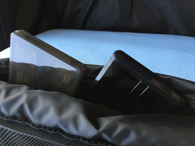 メッシュポケット下のジッパー付きポケットには薄めのSDカードケースや2.5inch HDDなど