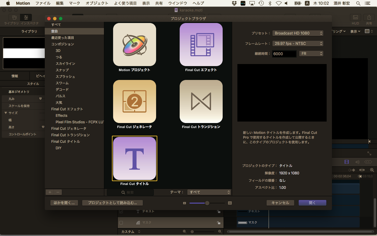 Motion5で保存後、FPCXを起動すると作ったタイトルがFCPXから利用できるようになっています。