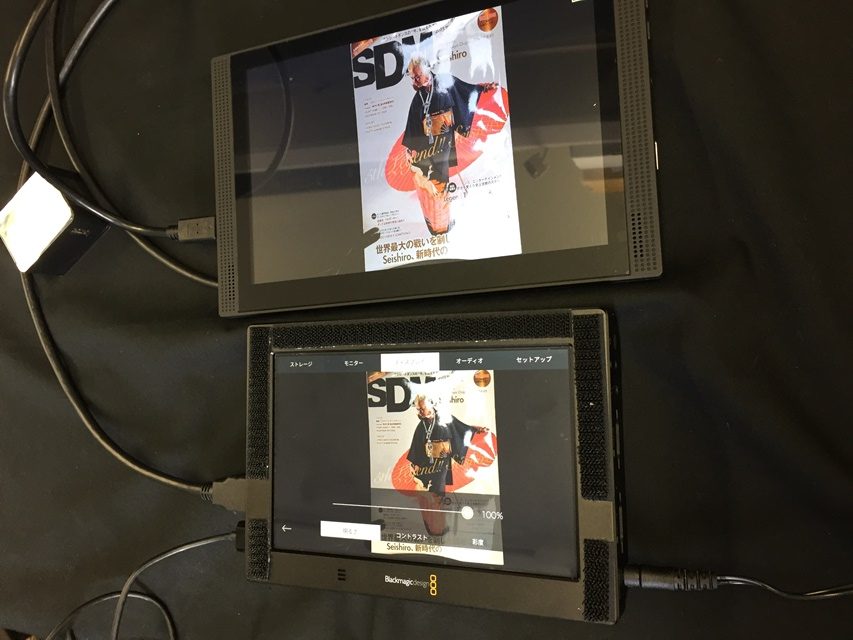 というわけでBlackmagicDesignのVideo Assist 4k(7インチ)と比べてみます。結構大きいですね。VA4Kの本体全体が液晶のサイズ。って感じです。