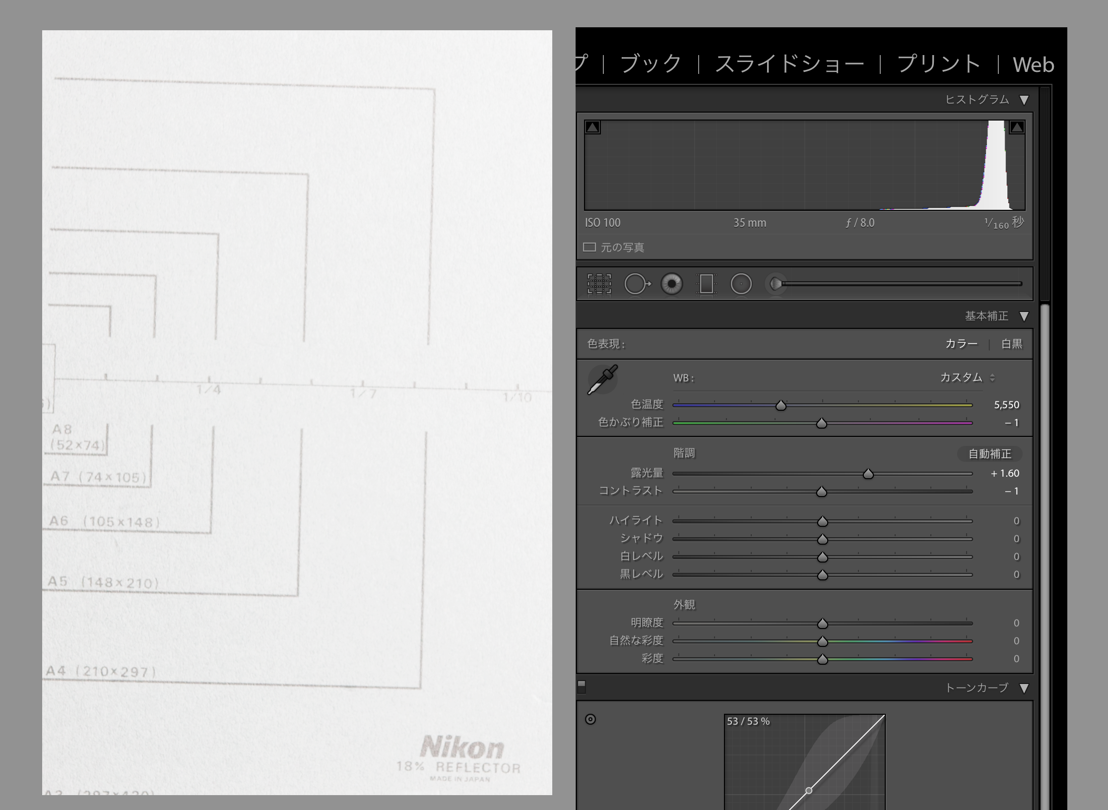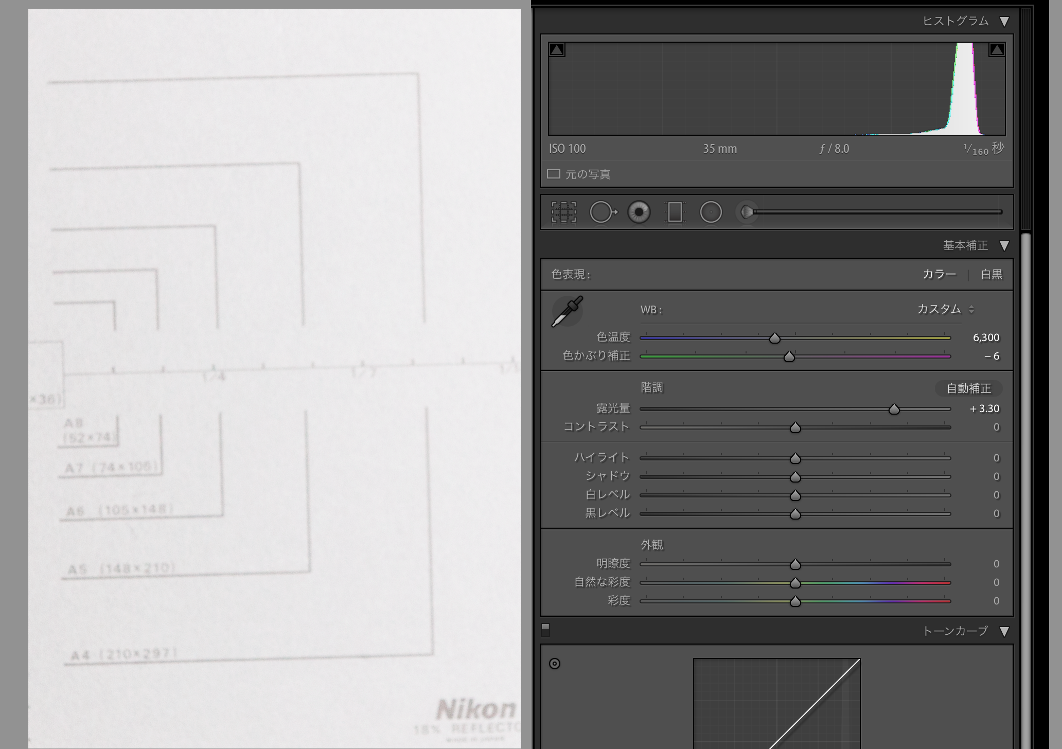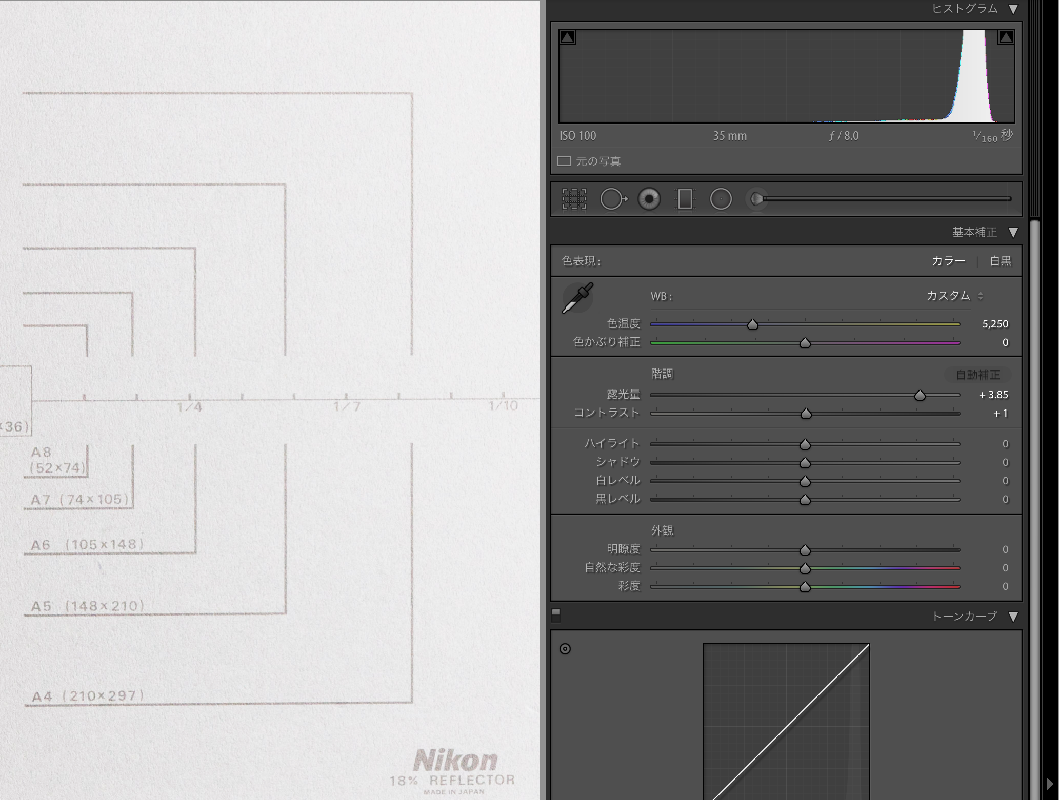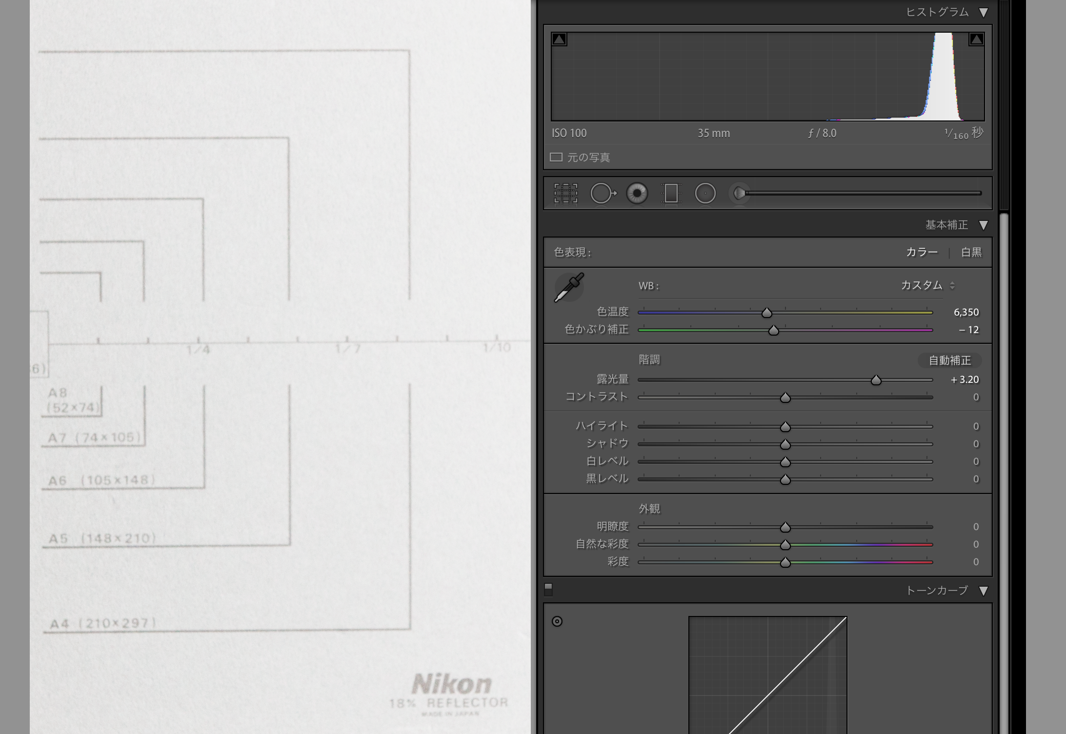 Adobe Lightroomにて、グレーカードに対して自動露出とスポイトツールによる色温度修正を行い、その時の露光量と色温度の値を測定する。