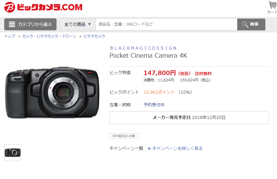 この件に対してビックカメラさんへ電話問い合わせしましたところ、どうやらビックカメラさんはBlackmagic Designから商品を直接おろしているわけではなく、間に商社が入っているとのこと。で、現在その商社が提示している発売予定日が12月20日。ということでした。