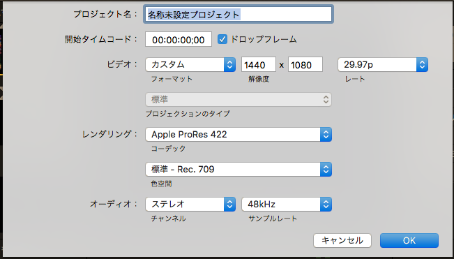 FCPXでプロジェクトの設定画面を開くと映像の解像度を変更できます。1080pHDを選んでいる場合はご覧の通り3項目から選べます。4:3の映像の場合はここで1440×1080を選べばいい。。。