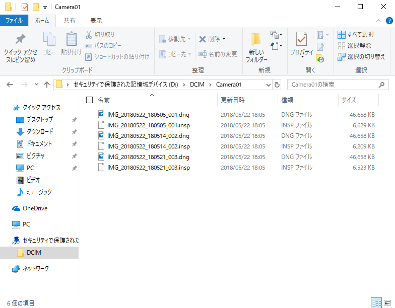 撮影後の SD カードの中身。360 度の写真データが保存されているのが分かります。