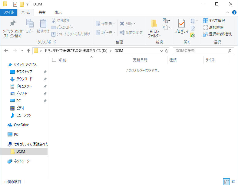 確かにSDカードの中身は空。フォーマットした後にDCIMというフォルダが作られているだけになっています。