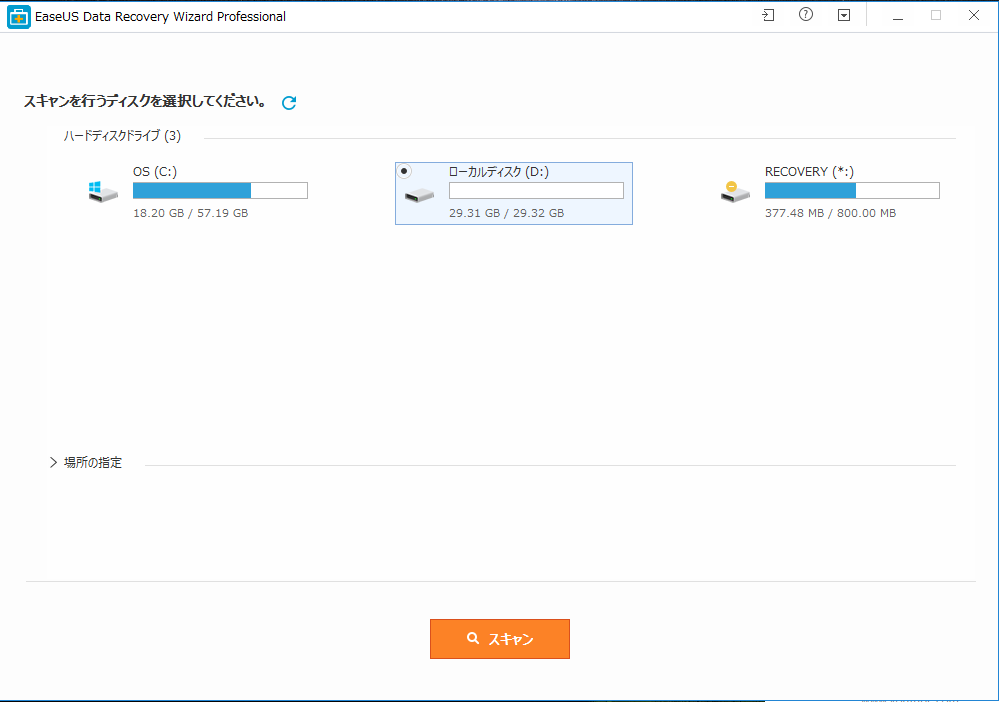 EaseUS Data Recovery Wizard Professionalを立ち上げて、目的のドライブ(今回マイクロSDはDドライブとして認識していたのでDドライブを選択しスキャンを実行します。