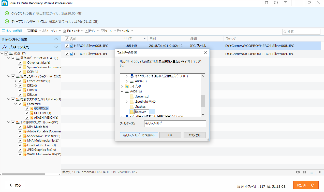 ディープスキャン結果のうち復元したい項目にチェックを付け、リカバリーボタンを選択するとファイルを保存する場所を聞かれるので別のドライブを指定して書き出しをするとリカバリーが開始されます。