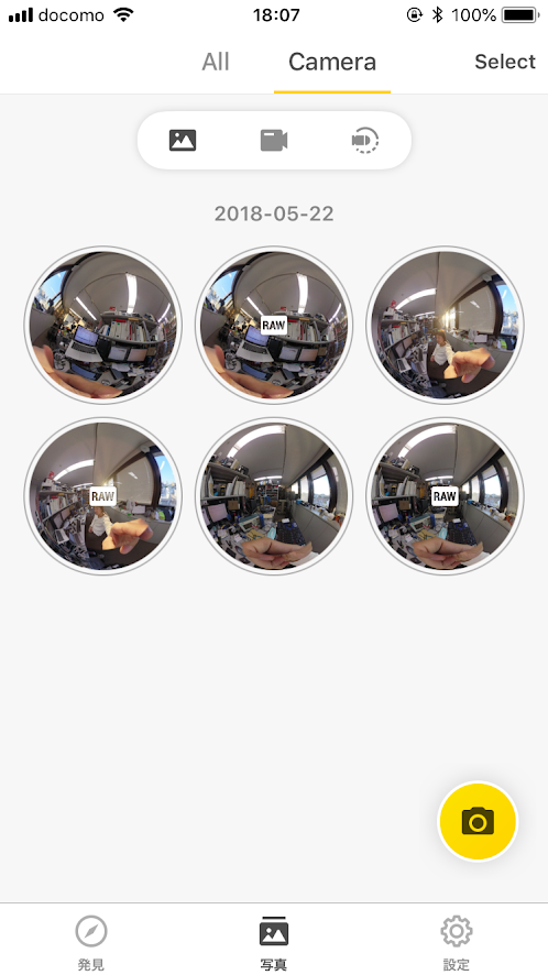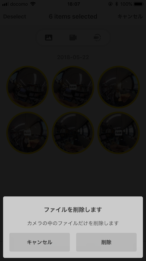 次にSDカードをInsta360 oneに戻し、Insta360 one を iPhone に接続した後、専用アプリから写真を選んで削除します。