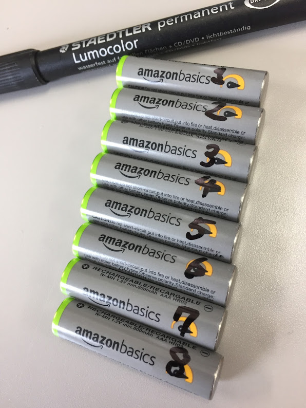 こうすることで例えば4本使う製品なら1-4, 5-8のグループで分けたりできますし、何番の電池が使い終わってるのかを覚えておくこともできます。