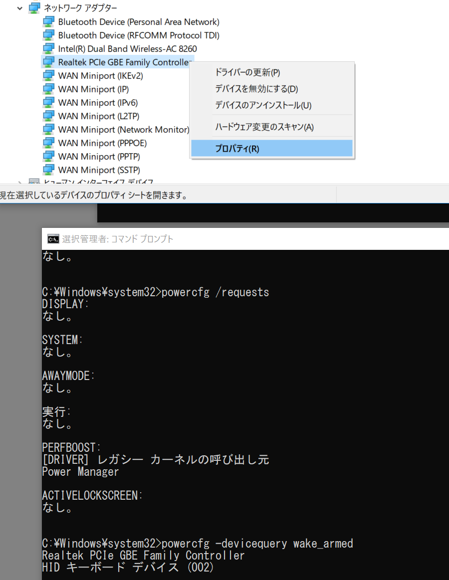 すると私の場合はRealtek PCIe GBE Family ControllerとHID キーボードデバイスが原因とのこと。