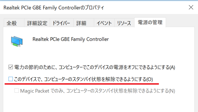 「電源の管理」からスタンバイ解除の許可を外しておきます。
