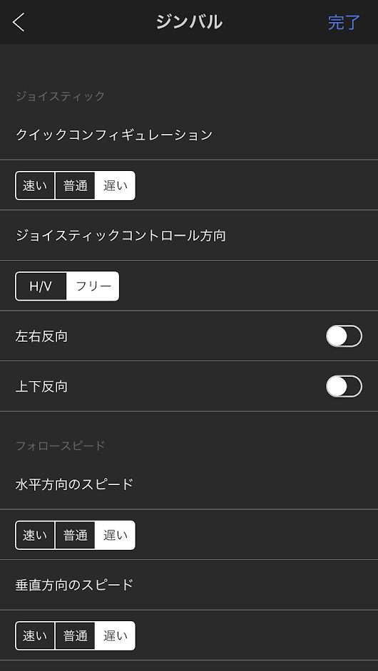 撮影画面はDJI Osmoのアプリに似たインタフェースでとても使いやすく出来ています。顔追尾・オブジェクトトラッキング機能もあり、当然のようにスローモーションやタイムラプス・モーションタイムラプスの設定も可能。設定画面ではジョイスティックの反応設定や方向変換・フォロースピードの設定も可能でかなり高機能であることがわかります。