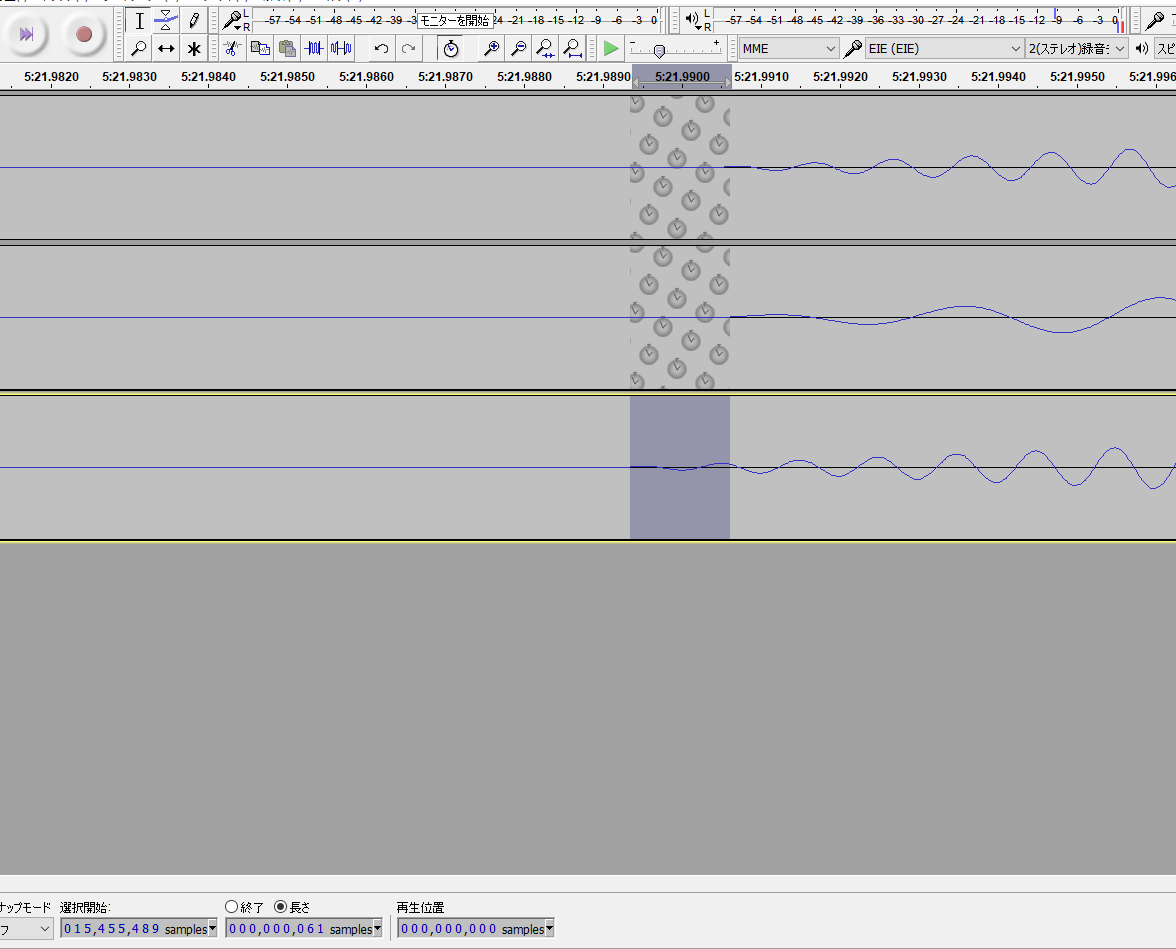 レコーディングされた音声をAudacityに読み込ませ、2つのトラックの開始位置を合わせたものがコチラ。開始位置がしっかりと合っている事がわかります。(今回はL:1kHz,R:400Hzの信号を使用)その状態で2回目の正弦波の入力位置を見てみますと、選択部分だけZoomH6の信号が早く始まっていることがわかります。この時の選択部分の長さは61サンプルでした