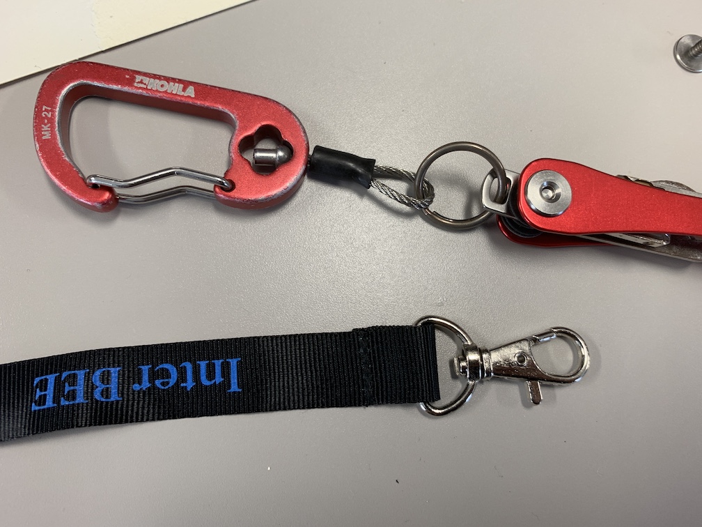 手持ちにあったカラビナをつけましたがどうもデカイ。のでInterBEEでもらったストラップに付いていたやつを暫定で。