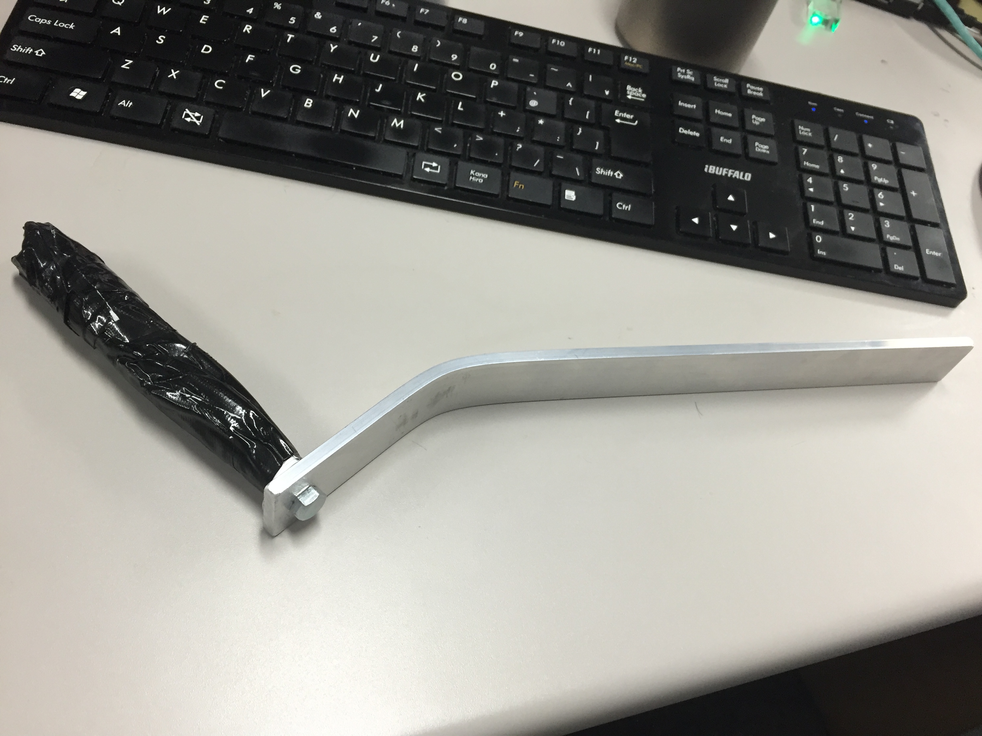 まずはアルミの平板をその辺の標識や手すりなど頑丈で丸いものに押し付けて曲げ、穴を明けボルト・ナット取り付けたのちパイプをグルーガン等で固定します。
