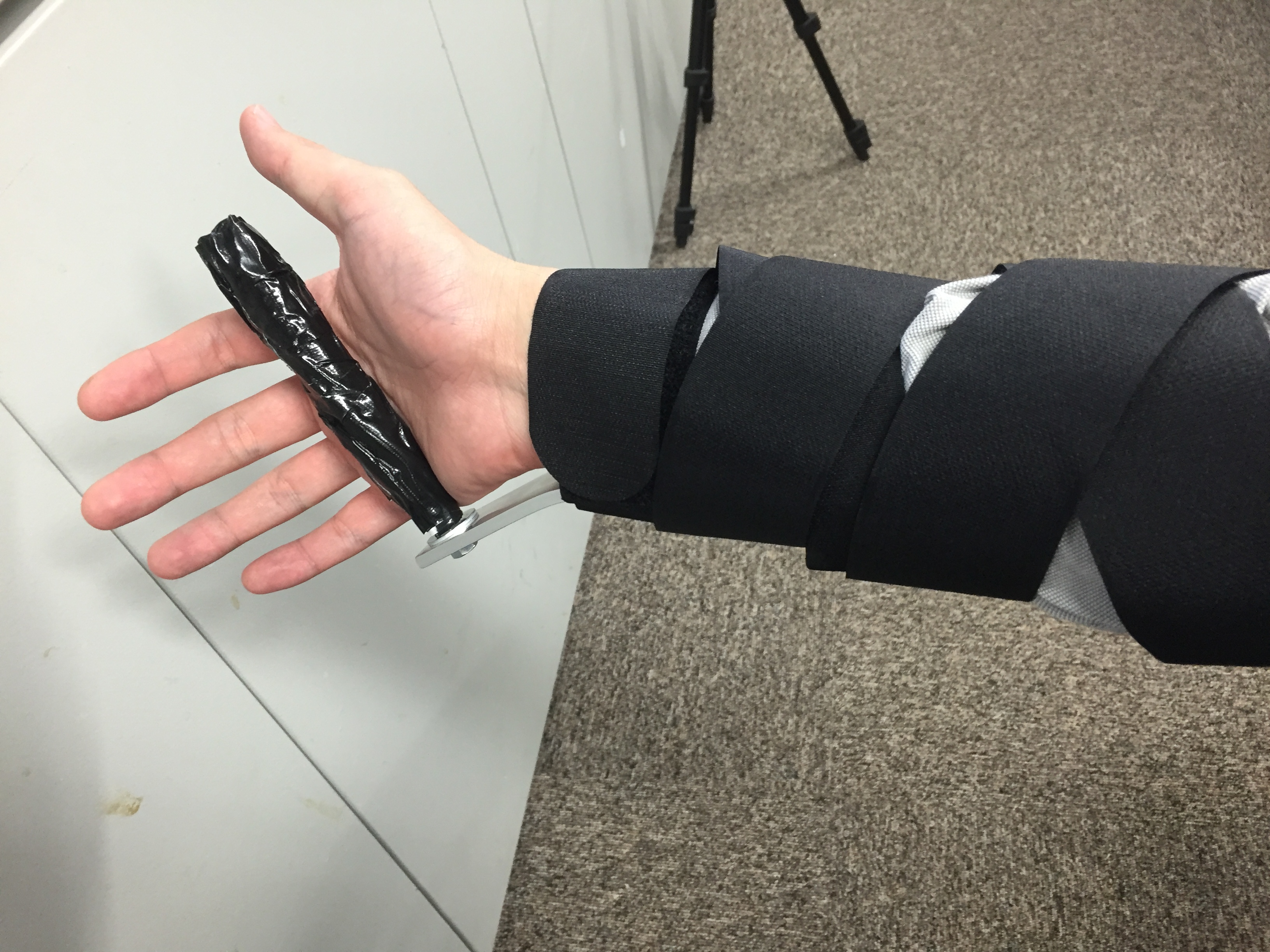 トンファーを持つ要領でアームブレイスを持ち、ベルクロの結束テープでぐるぐる巻きにして腕に固定。
